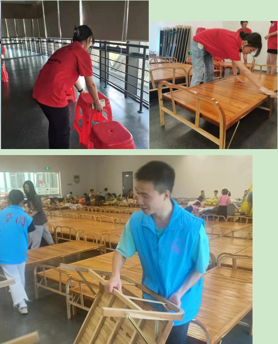 小队成员首先开始了对暑托班员工住宿场地的清扫,所有小队成员分工合作由外向里打扫,随后对员工午休床进行展开、擦扫与晾干。