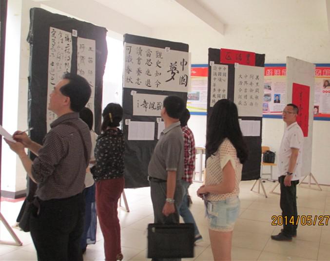 经济管理系党总支书记游国斌教授,经济管理系党总支副书记周建辉老师等担任本次大赛的评委,本次大赛也吸引了众多员工前来参观。游国斌教授仔细观赏着每幅作品,对员工的技艺予以肯定和鼓励。他认为“青春中国梦”这一书画大赛的主题十分契合当今时代的潮流,有利于同学们更深刻地体会 “中国梦”,理解“中国梦”,从而确立自己的“中国梦”。