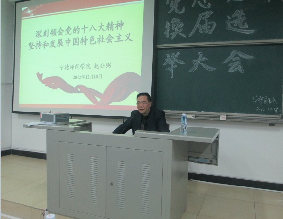 党的十八大是在我国进入全面建成小康社会决定性阶段召开的一次十分重要的大会,为了全系师生更好地学习贯彻党十八大基本精神,引导大家理解十八大精髓与实质进一步统一思想、深化认识。12月18日下午我系特邀宁德师院宣传部部长赵公弼老师带来一场学习十八大精神专题讲座,出席讲座的有宁德师院副董事长魏远竹教授、经管系党总支书记游国斌教授及我系全体师生。游国斌教授主持此次讲座。