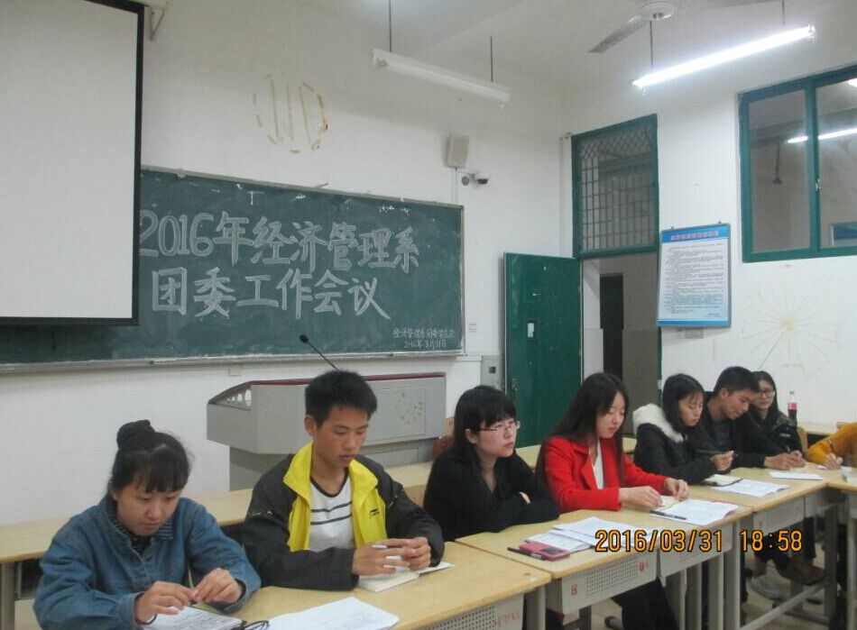 为进一步加强共青团的基层组织建设,充分发挥团支部在促进学习、丰富文化、凝聚力量中的积极作用,做好十佳团支部建设活动,2016年3月31日晚6:30分,经济管理系于求真楼Bb304成功召开2016年团委工作会议。出席此次会议的有系团委书记王佳佳,部分员工会干部,各班班长和团支书以及五大社团的负责人。