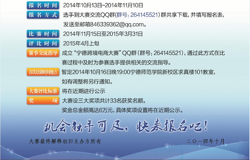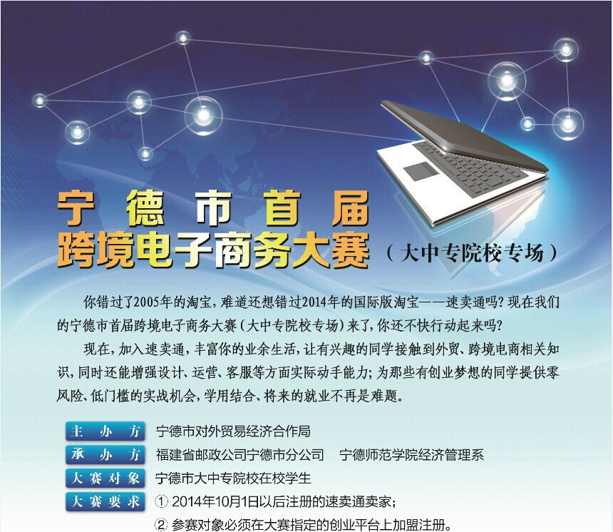 随着电子信息技术和经济全球化的深入发展,跨境电子商务在国际贸易中的地位和重要作用日益显现。跨境电子商务具有市场规模大、增长速度快、利润普遍较高、经营时间灵活、入门上手容易等明显的优势,是一种适合特别高校员工群体进行兼职创业、提升实践能力的途径。由宁德市对外贸易经济合作局主办、福建省邮政公司宁德市分公司、PA平台经济管理系承办的“宁德市首届跨境电子商务大赛(大中专院校专场)”,将面向全市大中专院校在校生,于十月拉开帷幕。宁德市跨境电商创业平台(以下简称“平台”,网址http://nd.tcesoho.com/)是建设在“速卖通”在线交易平台之上,充分整合多方优势资源,通过宁德市跨境电商创业团队为加盟平台创业的店家提供跨境电商入门培训,并提供运营、仓储、物流等一站式服务,减轻加盟者的后顾之忧。目前平台产品类目大约40种,平台SPU达4000多种、SKU达1万余种。同学们可自由选择平台提供的本土产品、国内产品,以及自主选择产品进行销售。竞赛旨在丰富同学们的业余生活,学到外贸、跨境电商相关知识,提高网店设计、运营、客服等方面实际动手能力,为那些有创业梦想的同学提供零风险、低门槛的实战机会,为以后的就业打好基础。