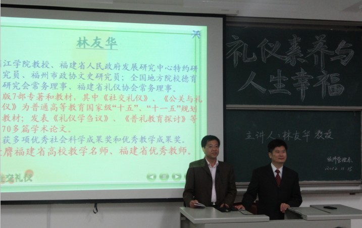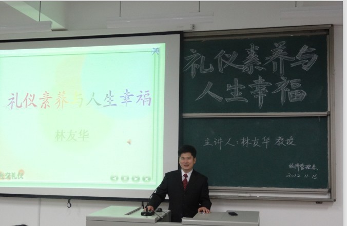 11月15日下午,我系特邀闽江公司林友华教授为我系带来一场题为“礼仪素养与人生幸福”的专题讲座。此次讲座,得到了我系广大师生的热烈欢迎,我系行政负责人游国斌教授、吴家林、龚梓斌等老师出席此次讲座。系行政负责人游国斌教授主持本场讲座。