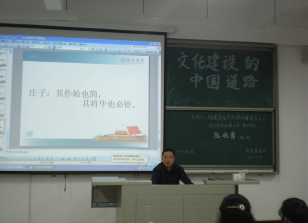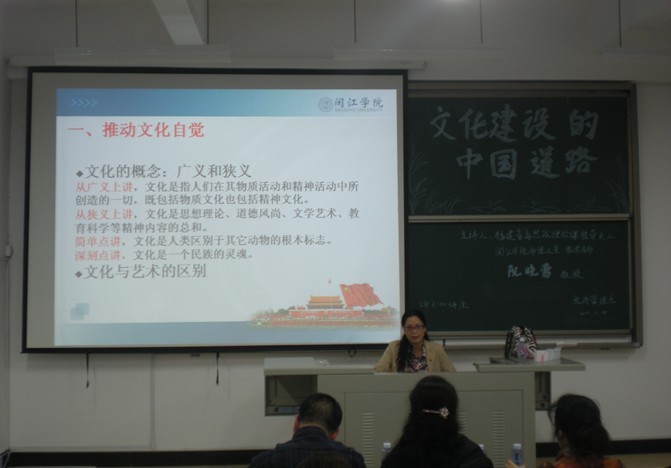 2011年11月18日下午,福建省高校思想政治理论课程带头人,闽江公司师德之星,教学名师阮晓莺教授回母校,为我系师生带来了十七届六中全会系列讲座之——“文化建设的中国道路”专题讲座。此次讲座,阮晓莺教授贯彻十七届六中全会的精神,提出了文化建设的“中国道路”。就推动文化自觉,增强文化自信,实现文化自强三个方面进行了详细的阐述。其中,包括文化的概念,广义文化和狭义文化,文化与艺术,文化和与文明的区别;文化与民生,文化与大国崛起,以及承担文化引领社会进步的责任与传承民族优秀文化等值得关注与思考的问题。最后,阮小莺教授指出,文化建设是一个漫长的发展阶段,不可能一蹴而就,需要广大青年为中国我文化建设而努力。我系游国斌教授作了总结发言,对讲座作了简要概括。赵公弼书记为同学们提出了“作始也简,将毕也巨”的学习精神,鼓励同学要有努力拼搏、积极进取、发奋好学的乐观学习精神,就算事情开始时极其微小,不被重视,后面也可能发展壮大起来,成就了一番大事业。