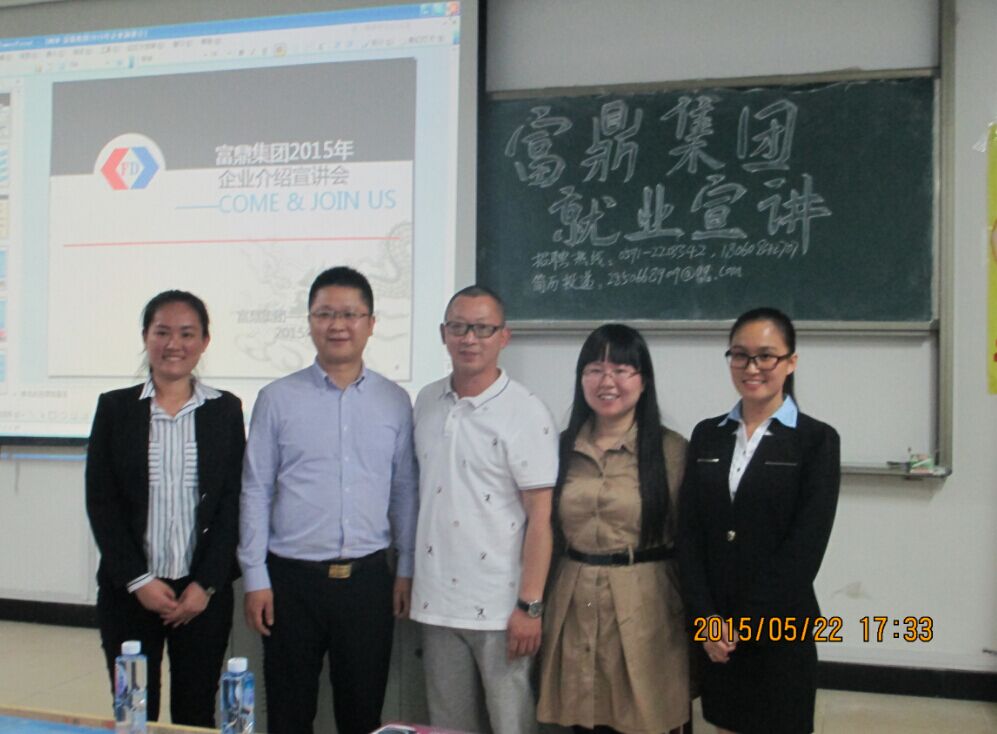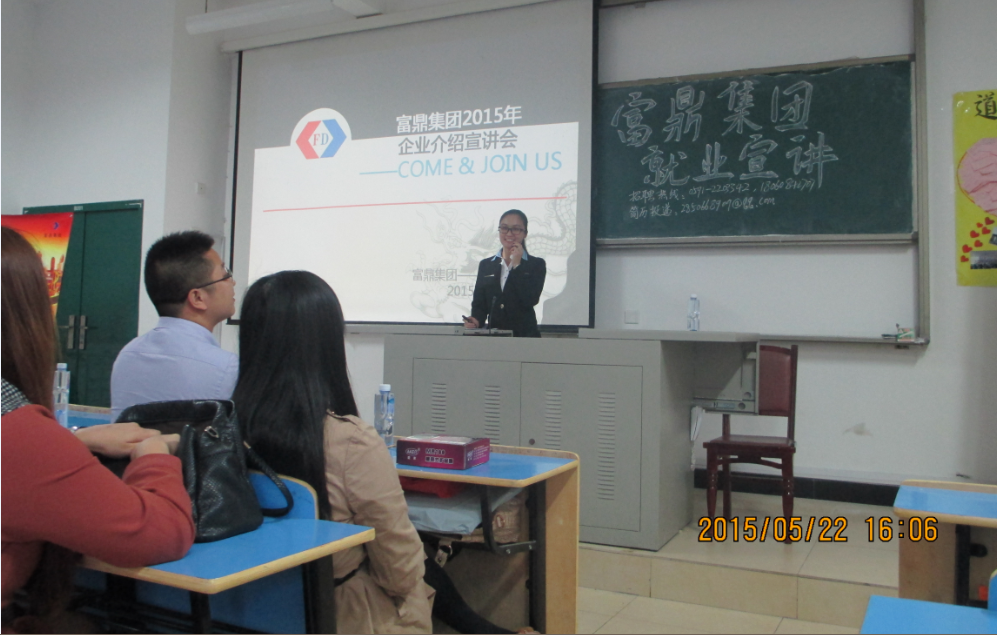 2015年5月22日下午4点,经济管理系于求真楼BB201教室开展福鼎集团就业宣讲会。本次宣讲会由富鼎集团人力招聘主管杨妙琼为我系师生进行就业宣讲。出席此次宣讲会的有经济管理系党总支副书记周建辉老师、系团委书记王佳佳老师及富鼎集团的总经理助理施国英。