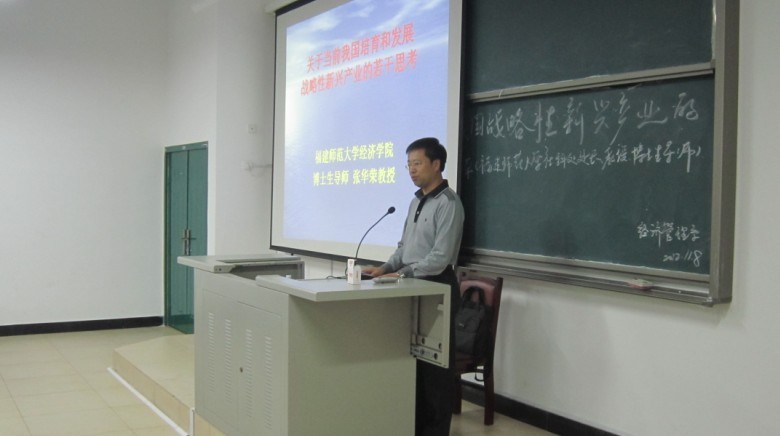 2012年11月8日下午,我系特邀福建师范大学经济公司博士生导师张华荣教授作了一场以“关于当前我国培育和发展战略性新兴产业的若干思考”为主题的学术报告。此次报告,得到了广大师生的热烈响应,参加这场学术报告的有宁德师院魏远竹副经理、宁德师院宣传部长兼系党总支书记赵公弼老师、经管系行政负责人游国斌老师、科研处彭彪老师、以及公司党政部门和我系的其他老师。系行政负责人游国斌老师主持讲座。