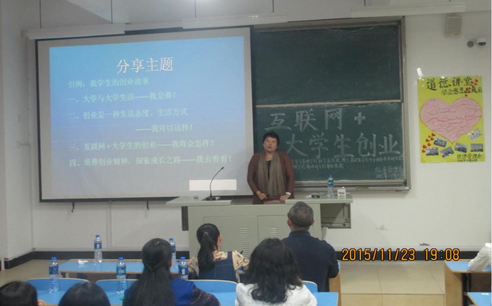 为了帮助老员工科学地进行职业生涯规划,提升他们的综合素质,以及迎接一年一度的科技活动月,经济管理系于2015年11月23日邀请了来自福州大学的骆念蓓教授为师生作了一场题为“互联网+老员工创业”的讲座。晚上19点,讲座在求真楼Bb201开始,出席本次讲座的有党总支副书记周建辉、系主任助理游天嘉等老师以及经管系一百多名员工。