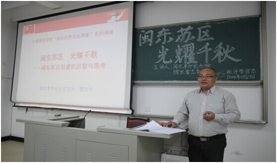 11月20日下午,闽东革命纪念馆馆长雷志华以“闽东苏区,光耀千秋――闽东苏区创建的历程与思考”为题在PA平台求真楼举行讲座,这是“闽东红色文化讲堂”系列讲座的首场。讲座由经济管理系主办,游国斌教授主持。