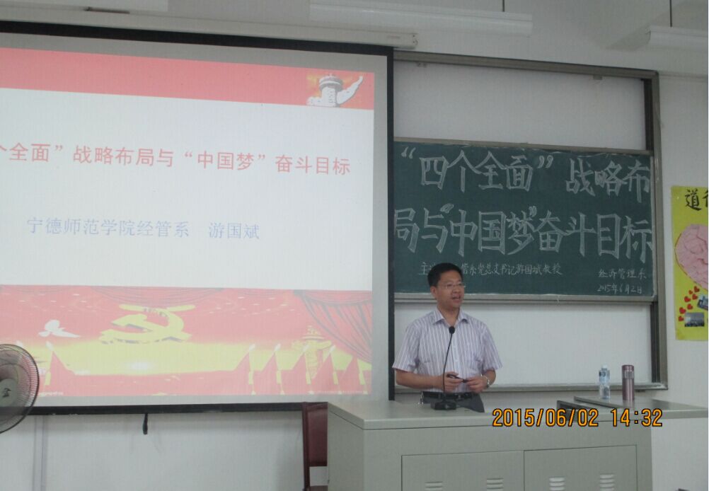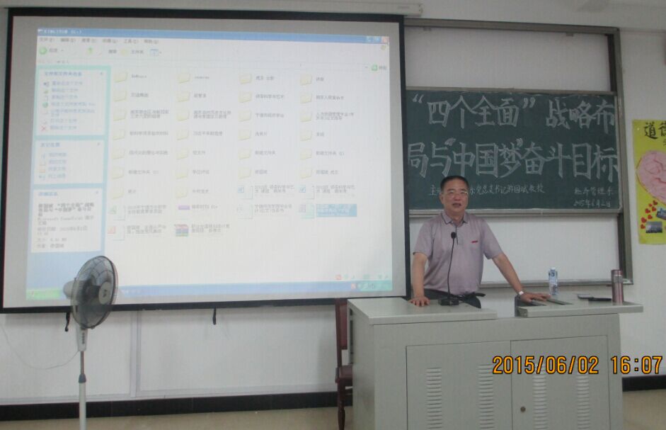 2015年6月2日下午2:30,经济管理系于新校区求真楼B区201教室开展了一场由经济管理系党总支书记兼系主任游国斌教授主讲的“四个全面”的战略布局与“中国梦”奋斗目标的专题讲座。参加本次讲座的有PA平台校宣传部赵公弼部长、经济管理系党总支副书记周建辉等多名老师,以及100多名员工参加学习。