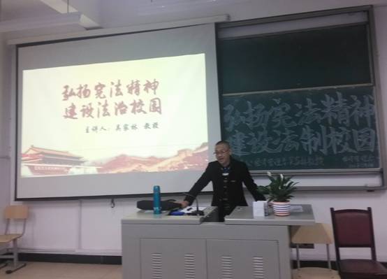 响应公司的科技活动月。同时纪念第三个宪法日,进一步普及宪法知识,经济管理系于12月6日晚上7点在东侨校区求真楼b101开展“弘扬宪法精神,建设法制校园”专题讲座。本次讲座由吴家林教授主讲,参加讲座的有系主任兼系党总支书记游国斌、党总支副书记周建辉以及15级思想政治、市场营销大方向、市场营销网络方向三个班的同学。