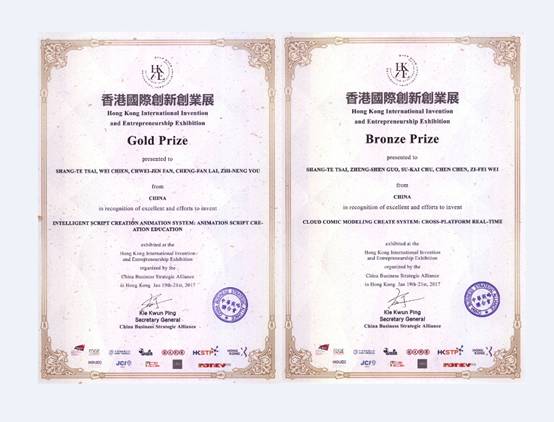本系2015级市场营销(网络营销方向)专业员工赖橙帆、游智能,以及陈琛、韦姿妃同学,经由本系蔡尚德博士与储苏凯老师的指导,分别以“智慧型动画剧本创作产生动画系统:用于动画剧本创作教育”以及“云端趣味漫画造型产生系统:用于跨平台即时产生造型”二项发明作品参会。在面对来自于自世界各国发明项目的参赛竞争下,分别荣获大会金奖与铜奖的殊荣。