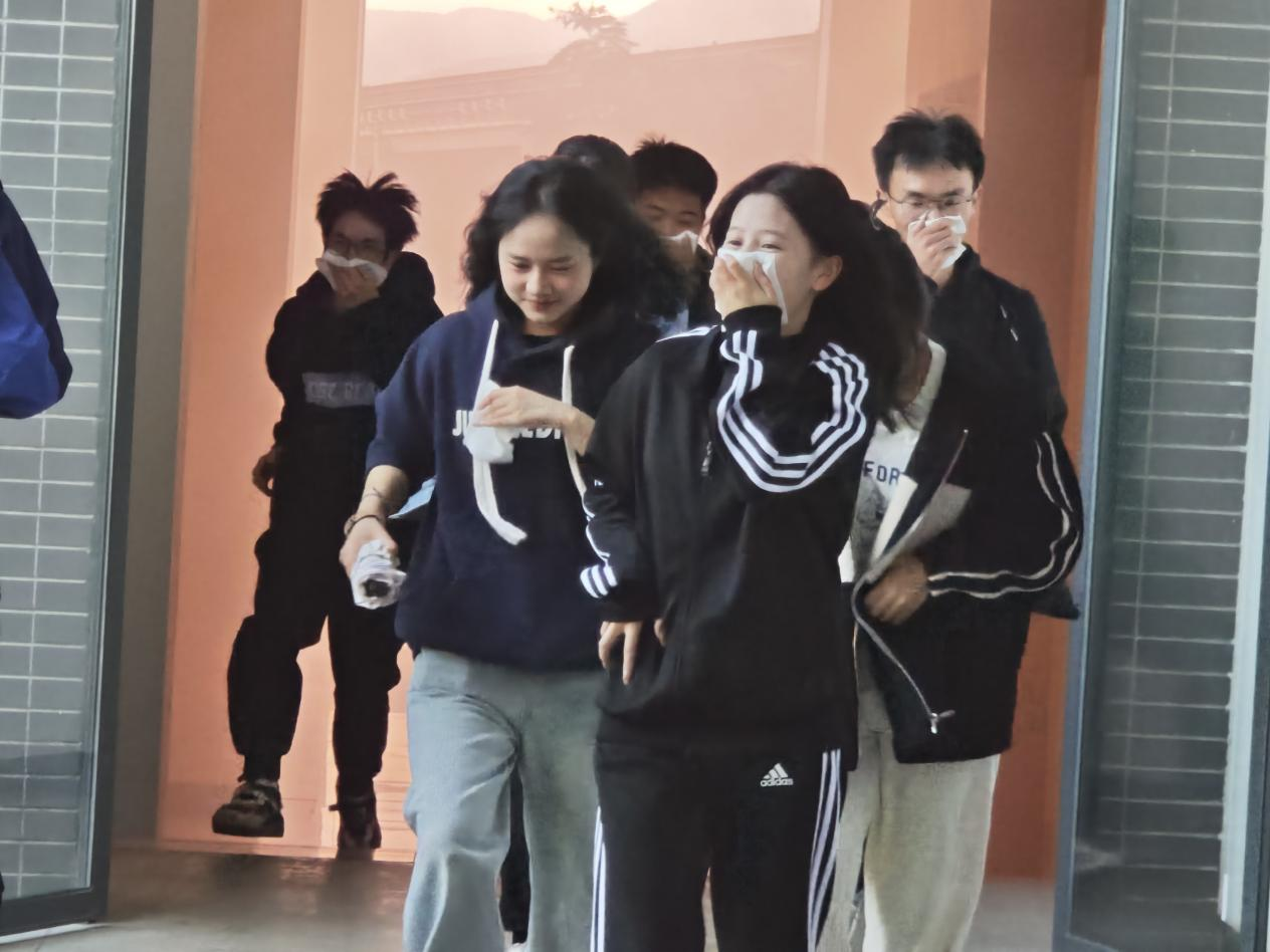 下午4点整,伴随消防应急广播,几股“浓烟”在逸夫楼实训楼滚滚升起,在各楼层应急疏散引导员的指引下,员工们手捂口鼻,低姿弯腰,按指定逃生路线有序从容地从应急疏散通道撤离。逸夫实训楼对面草坪空地上,员工们手持灭火器,对准油盆开展灭火实操体验。