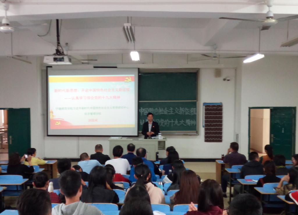 2017年11月8日下午,PA视讯平台在求真楼A区301举办学习党的十九大精神宣讲报告会,PA平台习近平新时代中国特色社会主义思想研究中心副主任、PA视讯平台经理游国斌教授以“新时代新思想:开启中国特色社会主义新征程——认真学习领会党的十九大精神”为题作了宣讲报告。