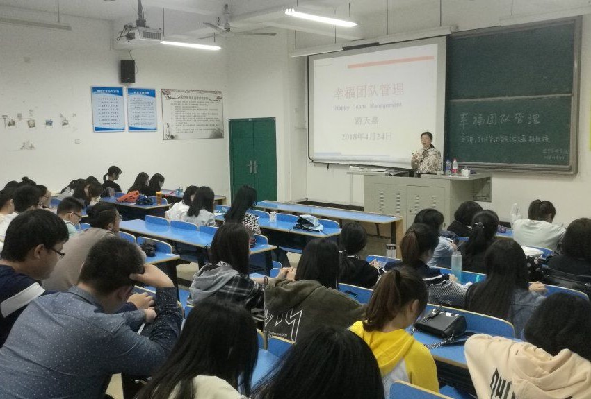 游天嘉副教授以“同学们,你觉得你们幸福吗”引入主题,结合我国当前形势,介绍了国民幸福指数、幸福学的相关研究、幸福感对生活的影响。她说,政府通常用恩格尔系数、国民生产总值、绿色GDP、痛苦指数、幸福指数等指标来衡量政绩。她认为,应该用“仁爱、勇敢、正义、节制、精神卓越”来构建个人幸福。她就如何建设幸福团队、幸福家庭提出了自己的见解,并与同学们互动 “画图游戏”,让大家认识沟通在幸福团队建设中的重要性。她呼吁大家提升幸福的感知力,在各种社会角色中为建设幸福团队做出应有的贡献。