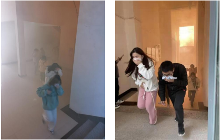 下午4点,模仿火灾现场的两股浓烟在逸夫楼A区东、西两侧楼梯升起,伴随者火灾警报器的响声,同学们用携带的毛巾捂紧口鼻弯腰低姿,从实验楼各消防疏散通道有序跑出……