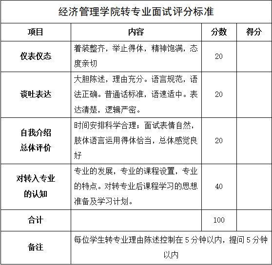1.转专业考核总分由第一学期专业排名百分值和面试组成,总分=面试成绩×30%+(100-专业排名百分值*100)×70%,按总分从高到低录取。