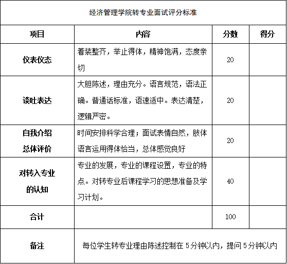 1.转专业考核总分由第一学期专业排名百分值和面试组成,总分=面试成绩×30%+(100-专业排名百分值*100)×70%,按总分从高到低录取。