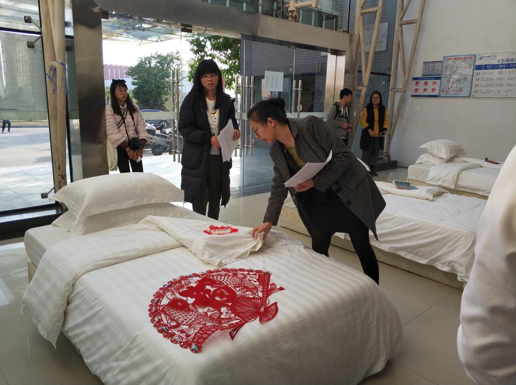 大赛内容包括中餐宴会摆台、中式铺床、英语口语等项目,以中餐摆台人员的礼仪展示秀和Hip hop舞蹈拉开序幕。选手们分组依次进行了技能比拼,他们仪态优雅美观,动作娴熟敏捷,将职业素养和自身气质展现得淋漓尽致。林平同学以“十里桃花”为主题的创意设计获得中餐摆台项目一等奖,其设计的台面营造了梦中仙境之感,给客人留下纯真、温馨的感觉。胡碎燕同学的开夜床设计主题为“剪彩为人,传承经典”,以中国剪纸与多彩糖果结合,象征甜蜜美满,寓意吉祥喜庆,获得中式铺床项目一等奖。