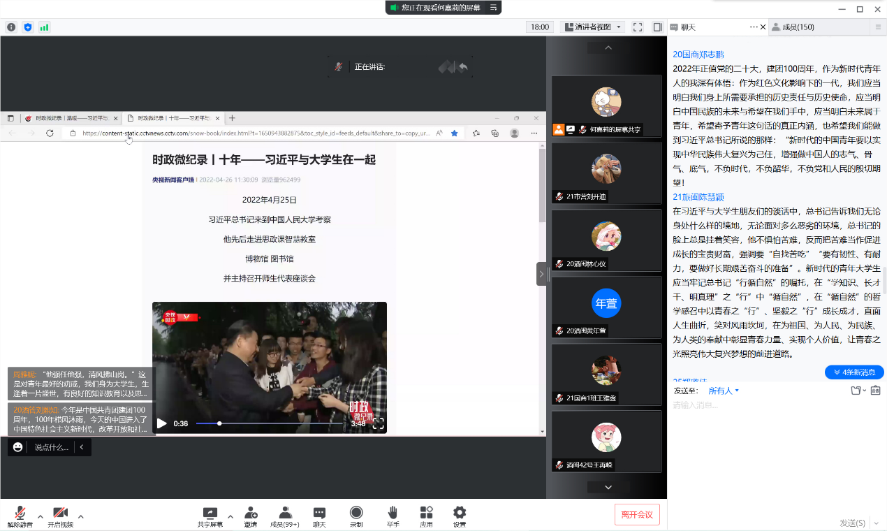 在本次学习交流会中,同学们深入学习了习近平总书记关于青年工作的重要论述,观看时政微纪录《温暖——习近平与老员工朋友们》和《十年——习近平与老员工在一起》。2020级国际商务班郑志鹏同学在交流会上说,作为红色文化影响下的一代,我们应当明白我们身上所需要承担的历史责任与历史使命,应当明白中国民族的未来与希望在我们手中,应当明白未来属于青年。2021级市场营销班刘开迪同学在本次学习交流会颇有感悟,她表示,新时代青年要牢固树立理想追求,将个人的志向同国家的前途、民族的命运、社会的需要、人民的利益相结合,坚持人民至上,坚守初心担当,开拓创新,锐意进取,在新时代书写新篇章。