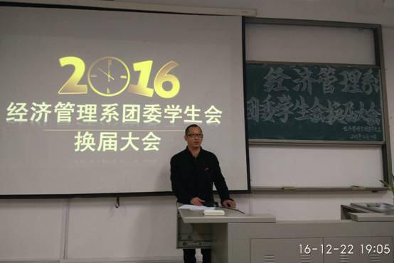 2016年12月22日晚7点,经济管理系于东侨校区求真楼bb101召开了团委员工会换届大会。出席本次大会的有经管系党总支副书记周建辉、员工党支部书记邱文君、辅导员杜艳芳以及全体员工会成员。