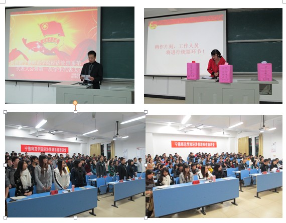2013年12月3日晚,共青团PA平台经济管理系第一次代表大会暨第一次员工代表大会在东桥校区求真楼BB201隆重召开。经济管理系党总支书记游国斌教授、经济管理系团委书记王佳佳老师、经济管理系员工党支部书记储苏凯老师以及经济管理系专职辅导员杜艳芳老师出席了本次会议。来自经济管理系各年级的两会代表共95人参加了本次会议。