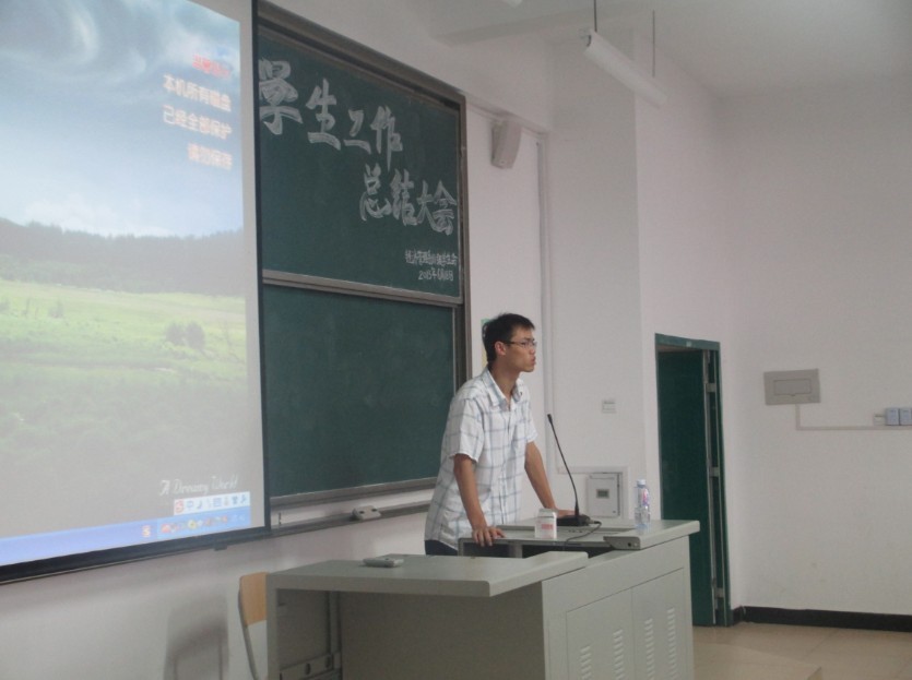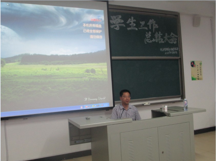 2013年6月18日下午三点半,我系在BB301召开了本学年的员工工作总结大会。出席此次会议的有系党总支书记游国斌教授,员工党支部书记储苏凯老师和我系专职辅导员王佳佳老师及全体员工会成员。