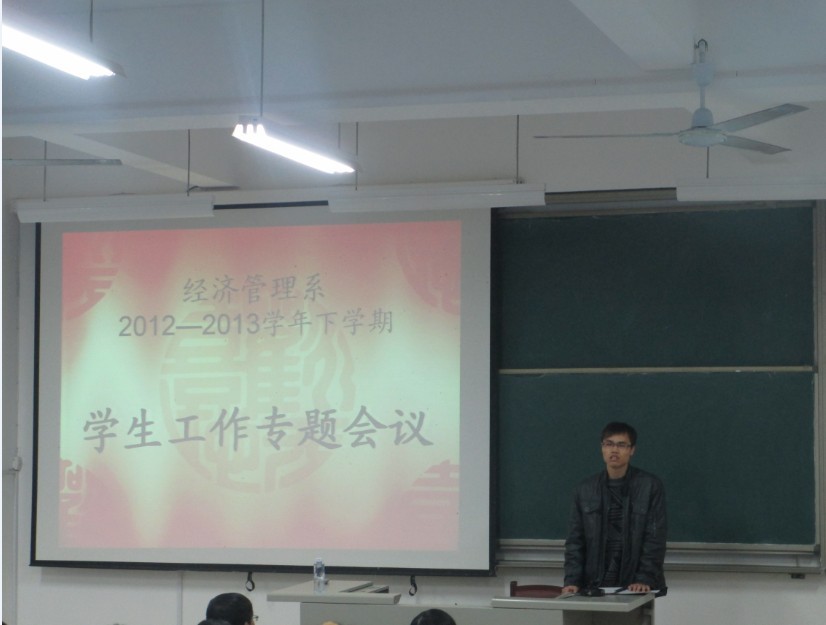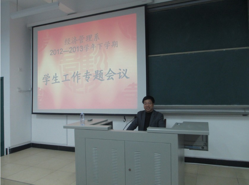 2013年3月8日晚上7:00经济管理系在求真楼B-B101召开本学期第一次员工工作会议。参加会议的有系总党支书记兼系主任游国斌老师,系员工支部书记储苏凯老师,辅导员王佳佳老师。会议由员工会主席主持。