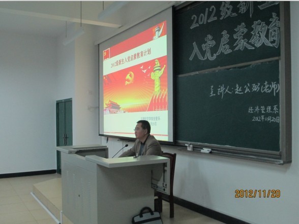 为了庆贺中共十八大的胜利召开,也为了2012级新生在入学之初树立对党各方面正确的认识。我系于2012年11月20日下午召开第二期入党启蒙教育专题讲座。讲座由我系党总支部书记赵公弼老师主讲,我系储苏凯老师也给同学们讲了他对党的自身感悟。我系全体新生参加了此次活动。