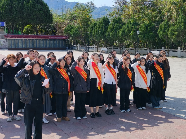 在烈士纪念碑前,师生们整齐列队,肃立默哀,表达对革命先烈的深深哀思和崇高敬意。员工代表上前敬献鲜花并致词,呼吁大家铭记历史,将革命精神内化于心、外化于行,以实际行动践行爱国主义精神。辅导员宋琴老师带领大家重温入党誓词和入团誓词,引导同学们在追思中坚定理想信念,将爱国之志付诸实践。