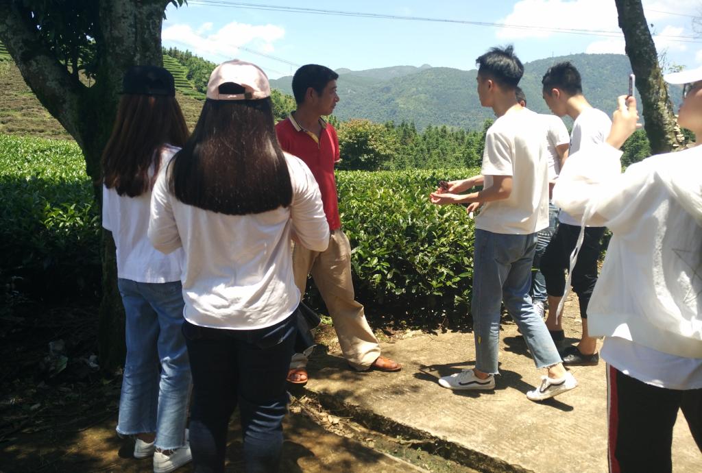 最后,也是本次实践活动的第三阶段,来到了八都镇猴盾村的平湖茶厂。在大山深处的平湖茶厂被一大片茶园包围着。团队对厂长进行访问,了解该茶厂主要经营方向、销量情况并用团队的专业知识与茶农交流,提出看法。茶是该村的主要产业,大大小小分布着许多茶园。在厂长的带领下,团队来到了茶园,看到茶农在烈日下采摘茶叶。因此,让队员们亲身体验了一下采茶的艰辛。在与茶农的交谈中,了解了茶青的价格、主要采摘季节、销售情况。为了不让茶叶错过最佳采摘季节,茶农们“争分夺秒”地采摘着。