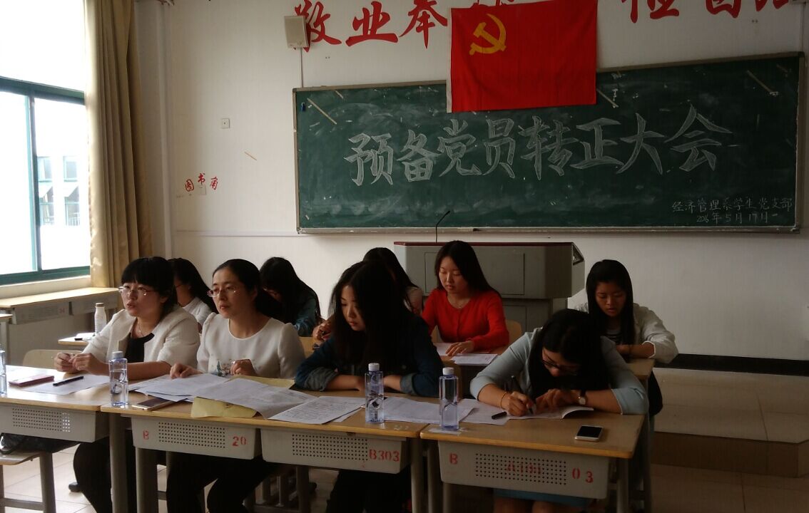 2016年5月17日下午,我系员工支部在求真楼Bb304召开了预备党员转正大会。经济管理系党务秘书兼员工支部书记周俪老师、系团委书记王佳佳老师、袁曦和孙锴老师、3位员工正式党员和13位预备党员参加了本次会议。