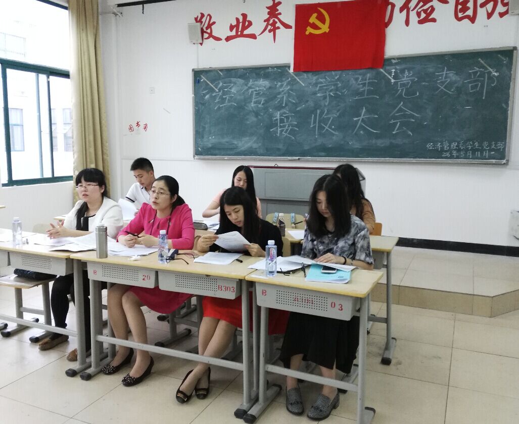 2016年5月11日下午5点,经济管理系于求真楼Bb304召开预备党员转正党内外群众讨论大会和思想汇报会、员工党员转正大会、接收预备党员大会以及两学一做学习教育活动动员会议。出席会议的有经济管理系党务秘书兼员工支部书记周俪老师、系团委书记王佳佳老师、袁曦和孙锴老师、2名员工正式党员、11名员工预备党员、12名发展对象以及4名党外群众。