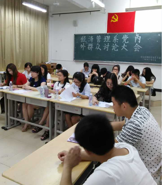 2015年5月26日晚上6点30,我系于求真楼B302教室召开了经济管理系党内外群众讨论大会。出席本次大会的有我系团委书记王佳佳、专职辅导员杜艳芳、以及孙锴、袁曦等多名老师及12名员工正式党员,10名预备党员和16名参加讨论的群众。大会由王佳佳老师主持。