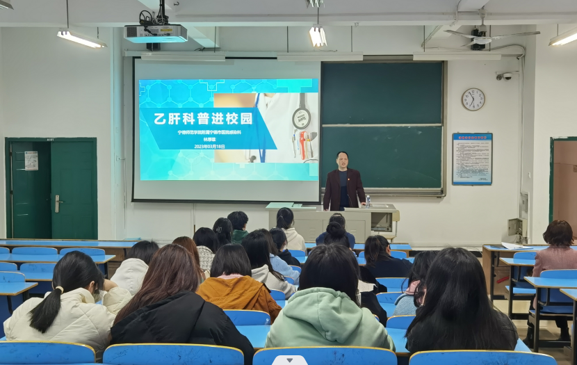 3月18日恰逢第23个“全国爱肝日”,林厚雄主任通过详实的数据和深入浅出的解析,将乙肝科普知识带进校园,传播了乙肝疾病的基本知识。他分析了病毒性肝炎的危害、特点,讲到病毒性肝炎在我国各类传染病中发病率最高,什么是乙肝两对半、大三阳、小三阳、转氨酶,分析了乙肝的传播途径有垂直传播和水平传播两种,提醒大家无论什么情况下,小三阳患者都应加强随访,掌握一些肝病常识。他还解释了什么样的乙肝需要治疗,如何正确对待乙肝的传染性,最后还介绍了预防乙肝的途径。
