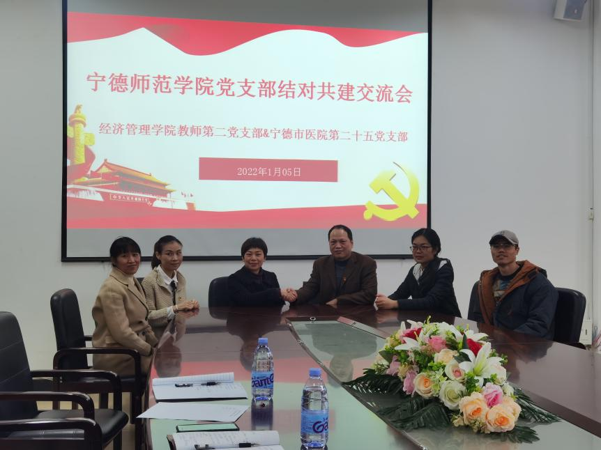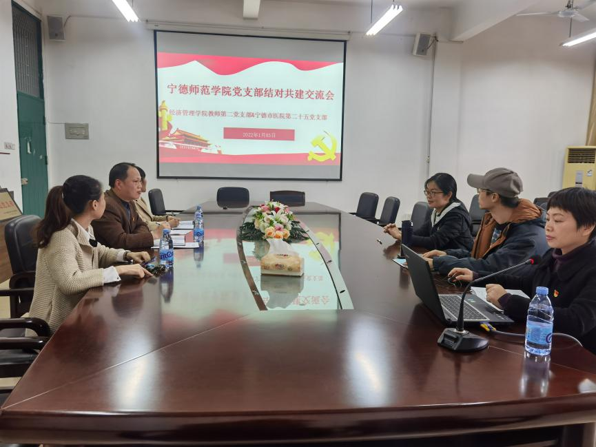 2022年1月5日下午,PA视讯平台教师第二党支部支委与PA平台附属宁德市医院第二十五党支部支委在求真楼召开支部共建交流会。会上,两个支部相互认识,并介绍了支部组成情况、支部发展情况。PA视讯平台教师第二党支部书记游天嘉同志介绍了支部建设工作概况,并分享了语文与文化公司、化学与材料公司一些先进支部的工作经验。PA平台附属宁德市医院第二十五党支部书记林厚雄同志就支部专业特色、工作性质及难点也作了剖析。两个支部成员也纷纷提出支部共建的建议。通过交流商讨,两个支部共同制订了新一年度的共建工作计划。双方表示,在新的一年里,要坚持以习近平新时代中国特色社会主义思想为指导,并肩努力提升基层党组织组织力,扎实推进党史学习教育和“学习•诊断•建设”行动走深、走实,以优异的成绩迎接党的二十大胜利召开。