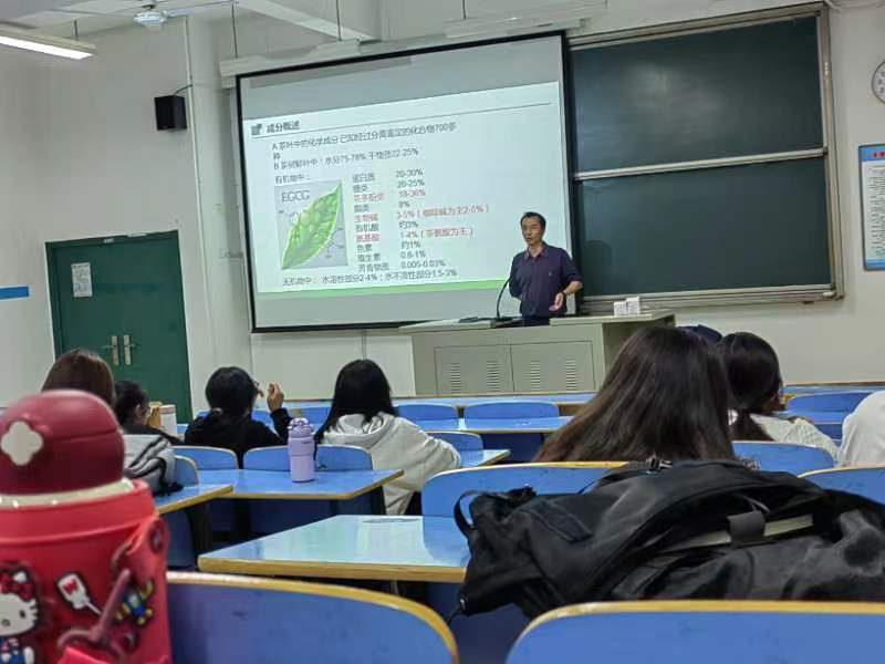 刘伟教授从茶叶特征性成分、茶叶的保健功效以及原理等方面介绍了茶叶方面的相关知识,列举饮茶的多项益处。同时,刘伟教授还阐述了宁德市茶产业发展存在的问题、茶产业可持续发展路径等,并与同学们进行了互动交流。