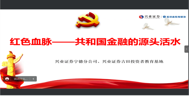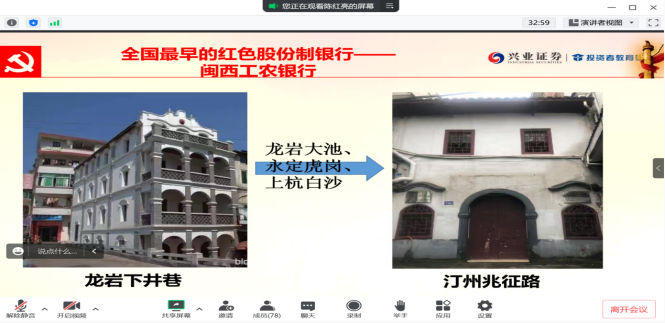 为深入学习贯彻党的二十大精神,让员工们深入了解红色金融,11月22日晚上,PA视讯平台邀请兴业证券古田投资者教育基地负责人陈红亮为员工们开展线上“红色血脉——共和国金融的源头活水”主题讲座,2021级财务会计教育1班和财务教育会计2班共75人参加。